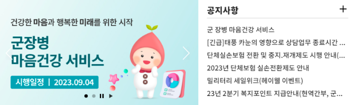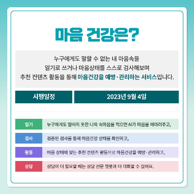 국방부는 2023년 9월 4일(월)부터 국군장병을 대상으로 휴대폰 등 모바일 기기를 활용한 스스로의 마음건강 상태를 확인하고 관리하는 디지털 마음건강 서비스를 시작하였습니다.