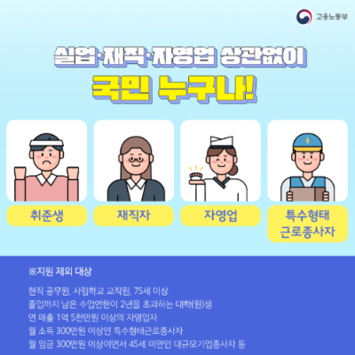 내일배움카드는 고용능력을 향상시키기 위해 국가에서 제공하는 교육비 지원 제도입니다. 일자리를 구하고 있는 취업준비생, 다른 분야로 이직 희망자, 업무역량을 향상을 위한 회사원, 은퇴 후 새로운 인생을 준비하는 중 장년, 새로운 경력을 희망하는 여성, 프리랜서, 대학교 3학년 생까지 기준을 만족하는 국민이면 누구나 내일배움카드를 받을 수 있습니다. 고용보험 미가입으로 일하지 않고 있는 상태의 구직자, 실업자, 고용보험이 가입되어 회사에 근무하며, 주 15시간 이상 파트타임을 하고 있는 근로자, 4대 보험 중 고용보험만 미가입인 근로자, 연 매출 1억 5천만 원 미만인 자영업자, 특수 형태근로종사자에 해당됩니다. 7월 1일부터는 "가사근로자의 고용개선 등에 관한 법률"에 따른 가사근로자에 대해 국민내일배움카드 훈련비 지원을 80~100%로 크게 확대하고 있습니다. 특히, 가사근로자가 선호하는 요리, 정리수납, 돌봄, 산후조리 등 직종은 100% 지원합니다. 국민내일배움카드 지원을 대폭 강화는 직무능력 향상과 함께 서비스 품질 경쟁력을 높여 정부 인증 가사서비스를 활성화하고, 맞벌이 가정의 일 가정 양립과 가사근로자의 근로조건 보호를 강화하기 위함입니다. 내일배움카드 대상에서 제외되는 조건은 연 매출 1.5억 이상의 자영업자, 월소득 300만 원 이상의 특수형태근로 종사자, 월 임금 300만 원 이상이며 45세 미만의 대규모기업 종사자, 현직 공무원, 사립학교 교직원, 75세 이상입니다. 또한 소득 연계형 국가지원금(기초생활수급금 등)을 받고 있는 경우, 중복해서 내일배움카드를 신청하실 수 없습니다.