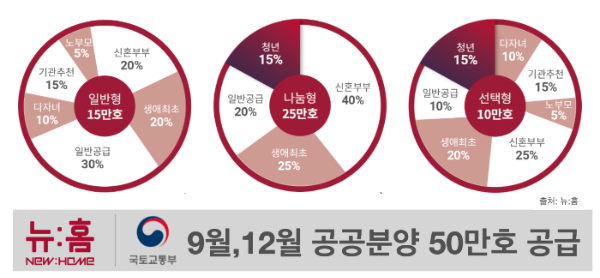 2023년까지 서울도심 등 우수한 입지를 가진 곳1.1 만호를 사전청약 조기 공급할 예정입니다. 9월 예정인 뉴홈 청약은 총 3,300 호로 마곡, 인천계양, 구리갈대역세권, 하남교산,안산장상, 군포대야미, 화성동탄 등의 입지이며, 12월 예정인 청약은 총 4,800 호로 대방동군부지, 한강이남, 위례, 교양창릉, 남양주, 부천, 안양, 수원 지역입니다. 무조건 많이 공급하는 데 치중하기보다는 면적을 키우고, 시설을 개선하는 등 전반적인 품질을 끌어올리겠다는 목표입니다. 뉴:홈의 가장 큰 특징은 다양한 주거선택권을 제공하기 위해 일반형( 25만 호), 나눔형( 10만 호), 선택형( 15만 호)인 3가지 주택 유형으로 나누어 제공하고 있으며, 나눔형, 선택형의 경우 장기저리전용모기지를 통해 주거비 부담을 낮출 수도 있다는 점입니다.